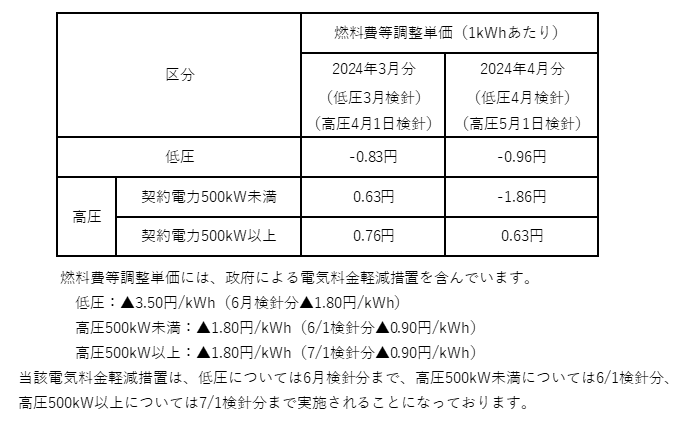 燃調費等調整単価のお知らせ(2024年3月分・4月分)