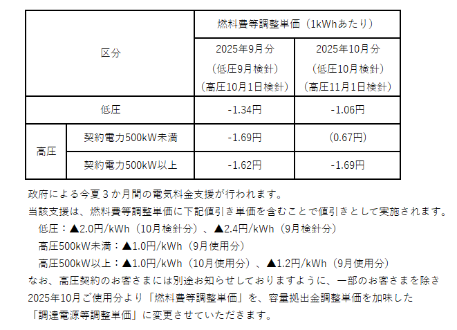 燃調費等調整単価のお知らせ(2025年9月分・10月分)